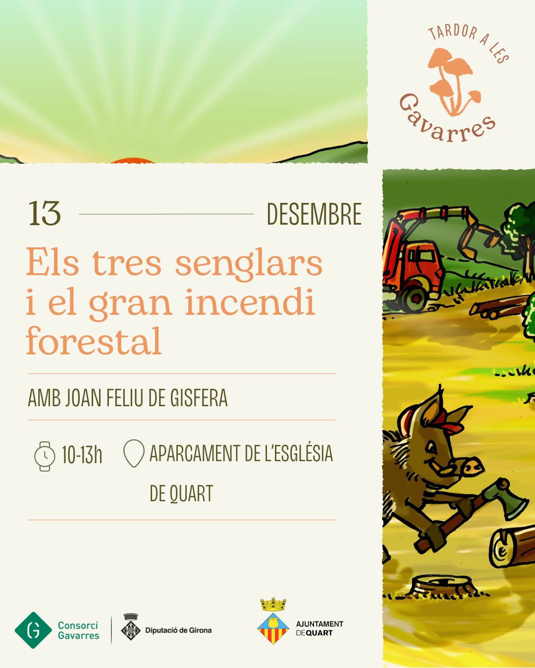 Aquí teniu la informació de l’última activitat d’aquest any 2025, una nova edició dels Tres senglars i el gran incendi forestal a Quart. Aprofitem l’entranyable història dels tres porquets i el llop per construir un relat al voltant dels incendis forestals i el que hem de fer per prevenir-los amb les eines de la gestió forestal. En Joan Feliu de Gisfera ens explicarà el conte i tot seguit, amb jocs i dinàmiques educatives aprendrem com hem de cuidar els nostres boscos pe fer-los resilients al foc. Aquesta activitat està pensada per mainada de 7 a 12 anys. L’activitat forma part del Passaport edunauta així que si veniu amb el vostre passaport us posarem un segell. Trobareu el conte i tot el material didàctic desenvolupat per Gisfera al següent enllaç.